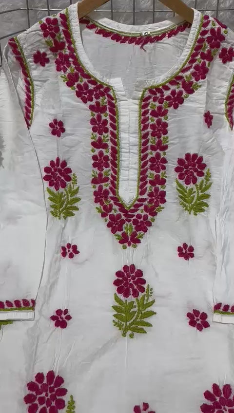 Pure Chanderi Silk thread kurta with self colored chikankari in Floral pattern paired with a matching palazzo to complete the look.