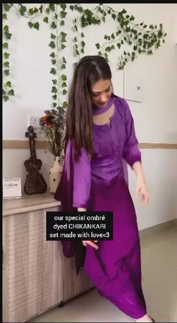 Purple Modal kurta with self colored chikankari in Floral & Jaal pattern paired with a matching pure chiffon dupatta and matching palazzo to complete the look.