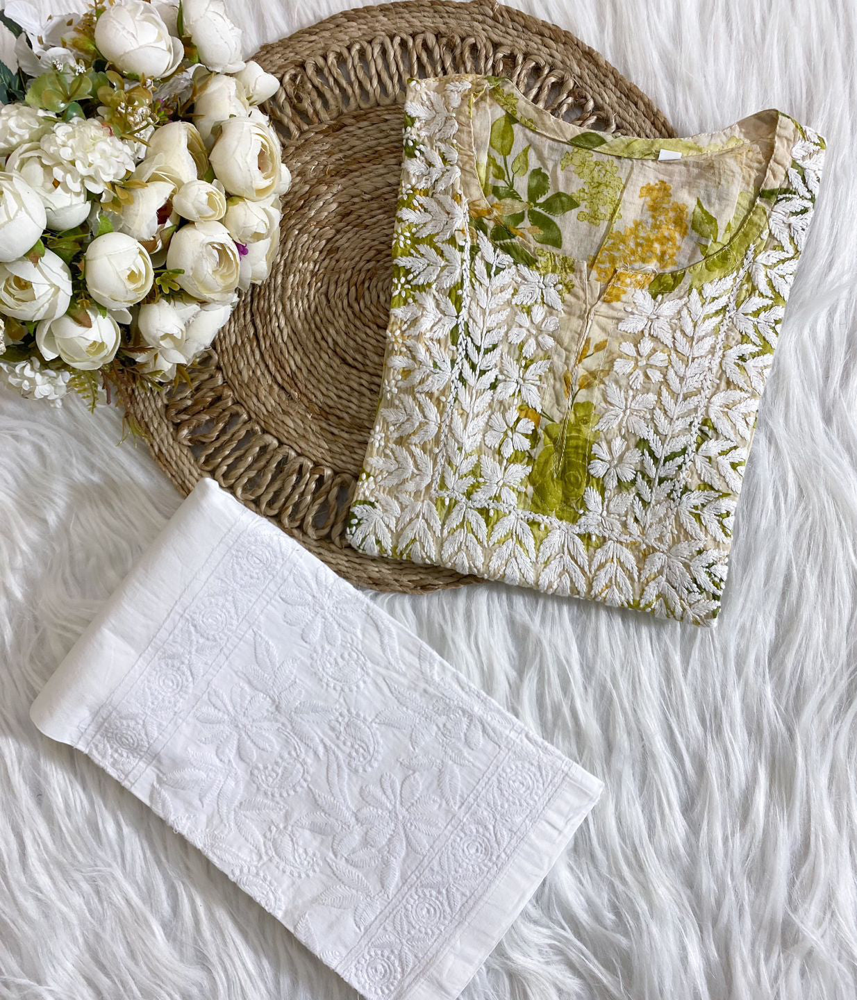 - ✨ Handcrafted Chikankari Work: Intricate white thread embroidery enhances the printed green fabric for timeless elegance.