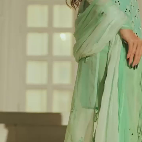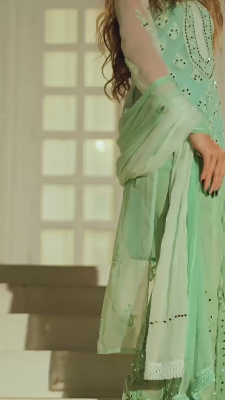 Yellow Long Georgette kurta with Self toned chikankari in Floral pattern with mirror work paired with a matching palazzo to complete the look.